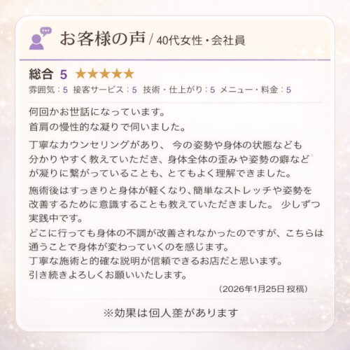 【お客様の声】慢性的な首・肩こりと姿勢の悩みが少しずつ改善