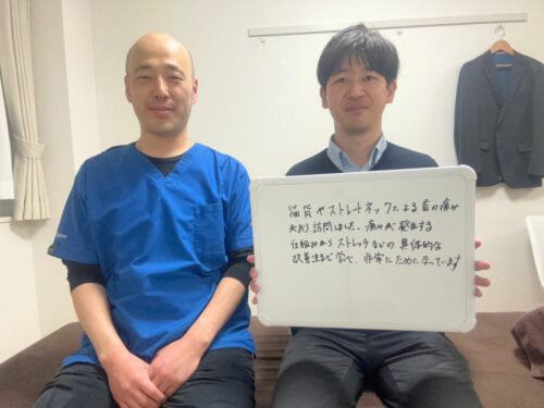 猫背やストレートネックによる首や肩の違和感でお悩みだったとのことですが、痛みが出る仕組みから、日常でできるストレッチまで具体的にお伝えしたことで「とてもためになった」とご感想を頂きました。